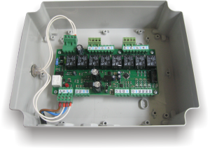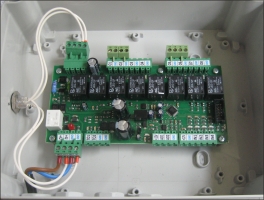 Řídící elektronika je umístěna v plastové rozvodné skříni. Základní deska MaUS12_LTC může ovládat 8 elektromagnetických ventilů, 2 proporcionální ventily signálem 0-10V nebo přímo PWM signálem. Je možné připojit 4 různé snímače s digitálním nebo analogovým výstupem 0-10V. Systém je možné libovolně rozšířit.