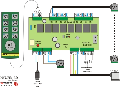Nějaké technické informace: Napájení celé sestavy je 12V. Elektronika má vlastní ochranu proti přepólování a stabilizátor pro napájení panelu a procesoru, který umí krátkodobě vyřešit pokles napájení při startování nebo při zapínání zátěží. Lze také doplnit záložní akumulátor, který zajistí napájení po výpadku na dobu několika sekund, než se např. uloží data. Základní elektronický modul je osazen 16ti výkonovými relé se spínaným proudem 6A. Napětí je na tyto relé přiváděno z hlavního relé, které slouží jako bezpečností a je spínáno tlačítkem pro nozové zastavení na ovládacím panelu zboku. MAUS12 má 8 vstupů, které mohou být jak analogové (0-10V) nebo digitální (0-28V), 8 digitálních vstupů. Protože je tento systém modulární, je možné jej dále rozšiřovat o další vstupy a výstupy, nebo pokud je třeba vyvinene zakázkový modul s požadovanou funkcí (např. PWM nebo analogové řízení ventilů podle jejich specifikace, rychlé tranzistorové výstupy, atd...)