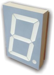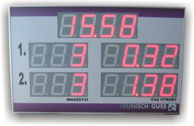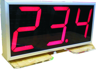 Zakázkově vyrábíme také velkoplošné zobrazovače. Jedná se o panely s hliníkovým rámem, kde jsou vyskládány jednotlivé segmentovky v červené barvě a s výškou číslic 10 cm.